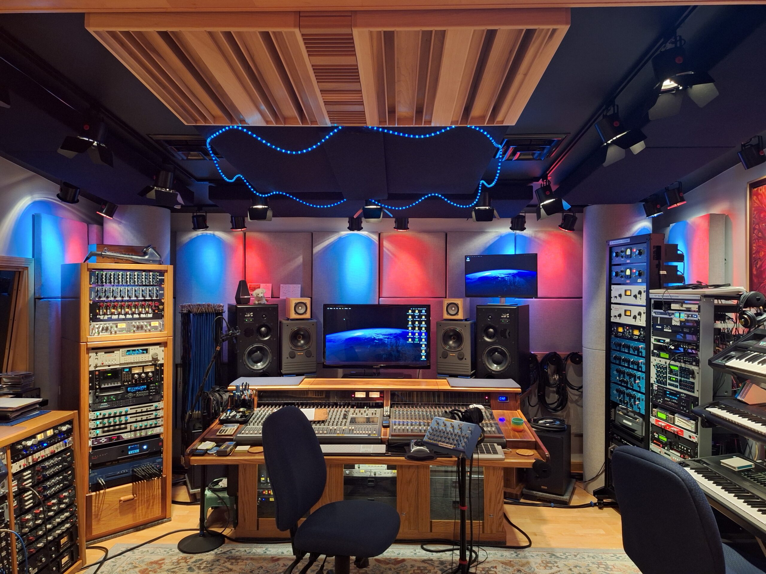 Control room- Over 300 sq. ft. with vaulted ceilings, double wall isolated ‘Room within a room’ construction and floating floors finished in maple hardwood. Acoustic treatments combine complex internal room geometry, custom built acoustic broadband absorber panels, ASC (Acoustic Sciences Corporation) large diameter Tube Traps, custom designed & built 1D & 2D solid hardwood Quadratic Residue Diffusors and Polycylindrical diffusors.